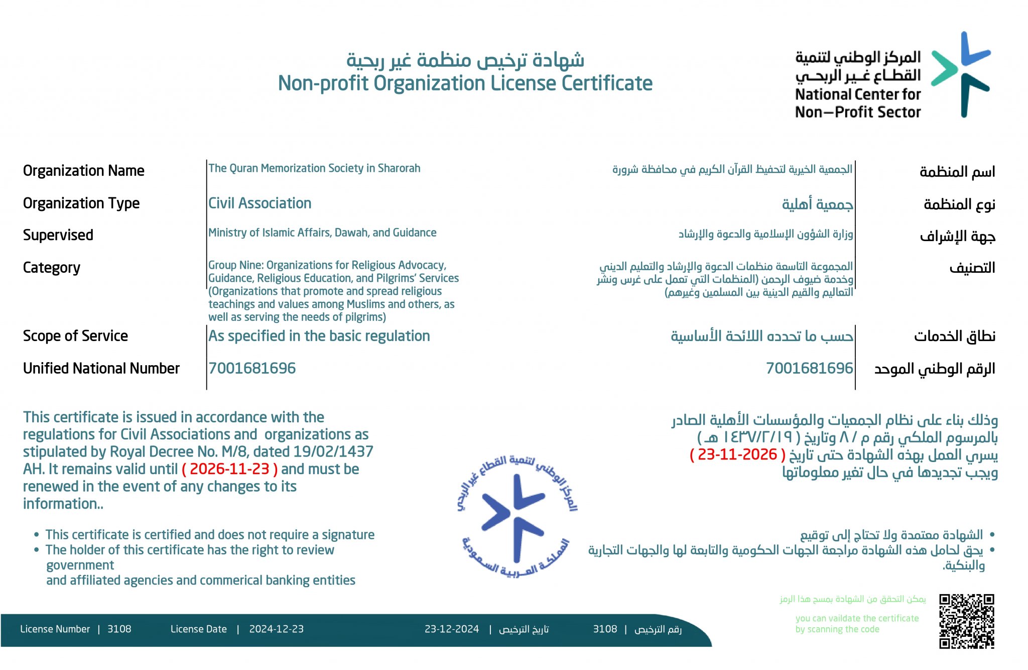 شهادة تسجيل الجمعية